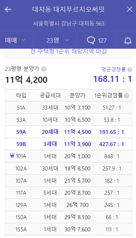 - 최근 분양한 대치푸르지오써밋(아파트) : 전용 51㎡ 10억 3,100만원 이상