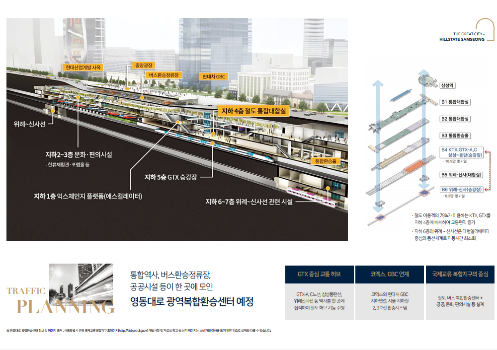- 영동대로 지하공간 복합개발사업 : 지하철 2호선 삼성역~9호선 봉은사역 구간에 수도권광역급행철도(GTX A·C노선), 도시철도(위례~신사선), 지하철(2·9호선), 버스·택시 등의 환승을 위한 복합환승센터 설립을 추진 중 (21년 6월 착공, 28년 완공 목표)