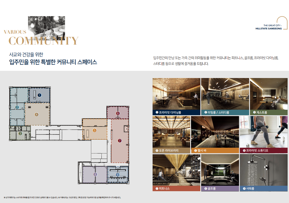 - 커뮤니티시설 : 프라이빗 다이닝룸, 미팅룸, 스터디룸, 게스트룸, 오픈 라이브러리, 헬시바, 프라이빗 짐, 피트니스 센터, 골프룸, 샤워룸 등