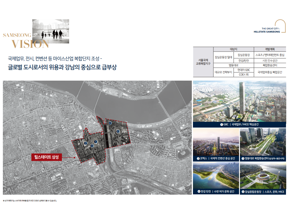 - 강남업무지구 직주근접 단지 : 포스코센터, 현대자동차그룹 글로벌비즈니스센터(GBC), 테헤란로 등