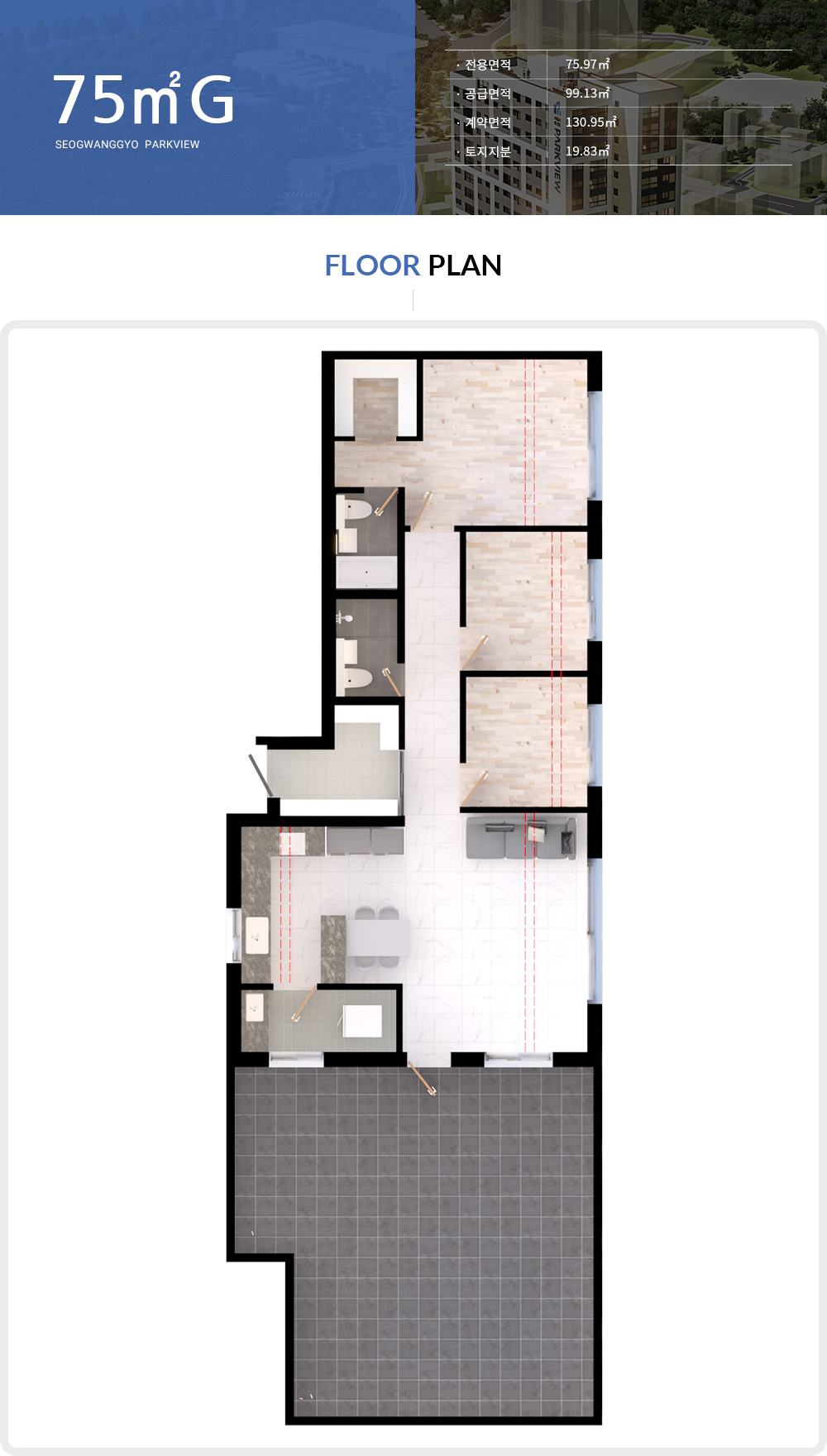 - 75G : 거실1, 주방1, 욕실2, 침실3, 다용도실, 드레스룸1, 발코니