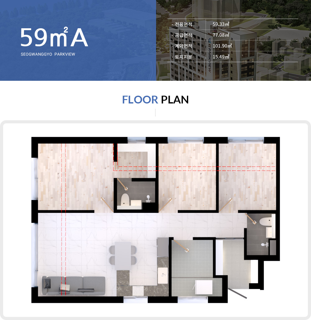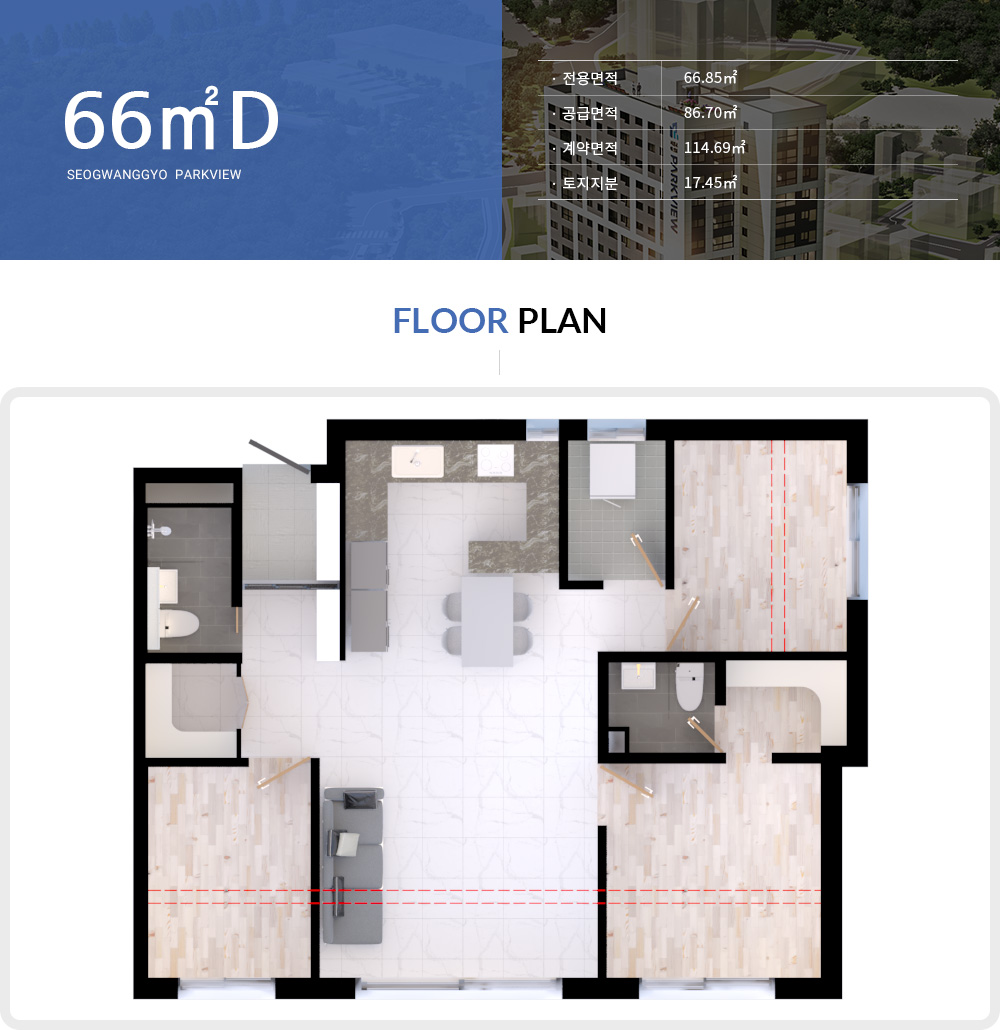 - 66D : 거실1, 주방1, 욕실2, 침실3, 다용도실1, 드레스룸1, 팬트리1