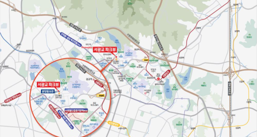 - 도로 : 영동고속도로, 용인~서울고속도로, 수원외과순환도로, 광교산로(경수대로, 창룡대로 진입 용이)