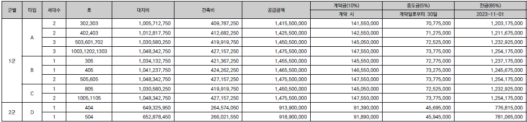 - A(전용 49㎡) 10세대, B(전용 49㎡) 4세대, C(전용 49㎡) 3세대, D(전용 32㎡) 2세대 공급