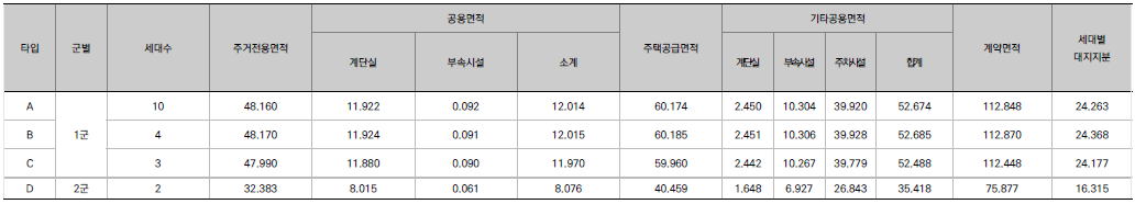- A(전용 49㎡) 10세대, B(전용 49㎡) 4세대, C(전용 49㎡) 3세대, D(전용 32㎡) 2세대 공급