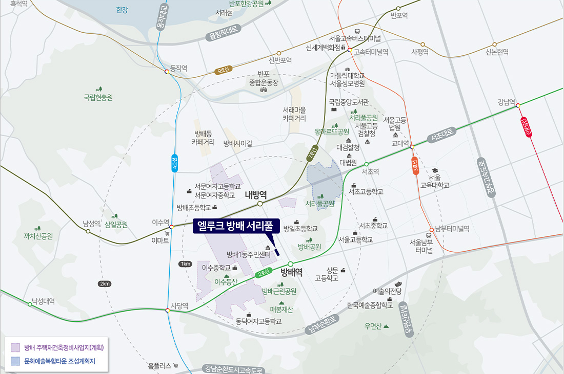 - 국립중앙도서관, 예술의 전당, 법원, 검찰청, 방배동커피거리 등