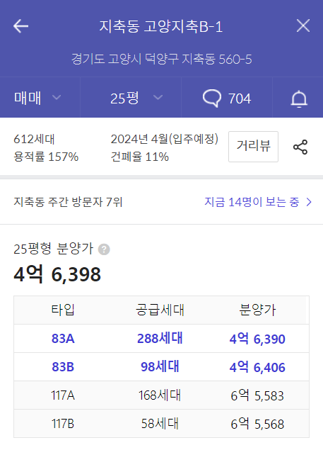 - 21년 9월 분양 고양지축B-1(공공분양) : 83㎡ 4억 6,390