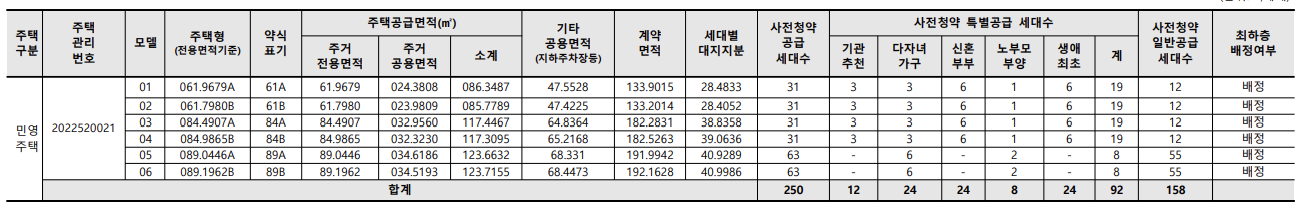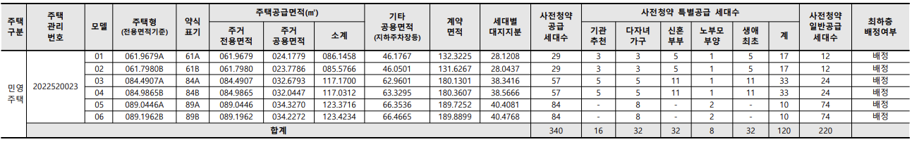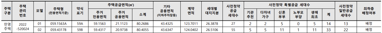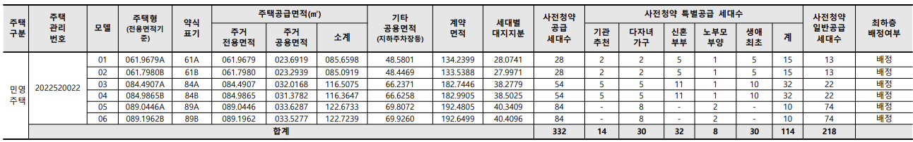 층수 | 동수 | 청약 물량(세대) | 특별공급(세대) | 일방공급 (세대) |