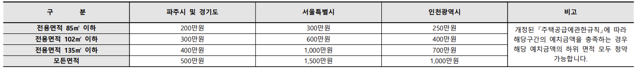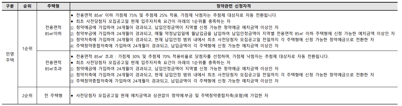 ① 청약예금 : 해당 주택에 신청 가능한 청약예금에 가입하여 24개월이 경과하고, 청약예금 지역별, 면적별 예치금액 이상인 1순위자