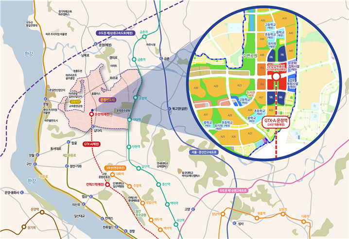 - GTX운정역 : 교통광장(규모 28,000㎡), 문화공원, 청룡두천 수변공원 등 트리플 광장 조성