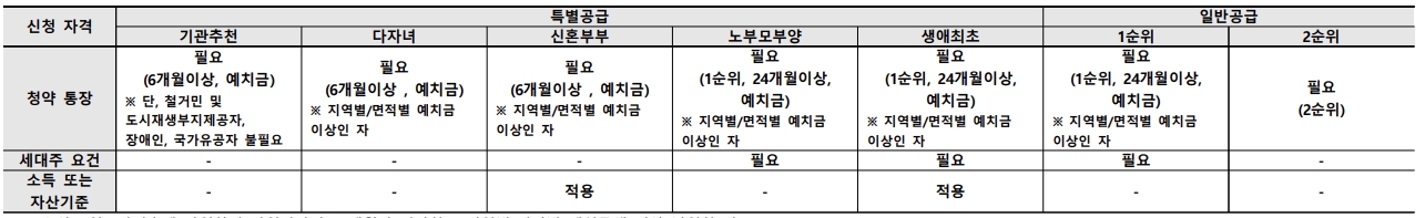 • 사전당첨자 모집공고일 현재 다음 특별공급 유형별 신청자의 청약통장 자격요건을 갖추어야 함.