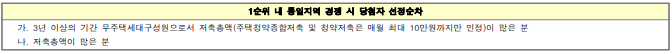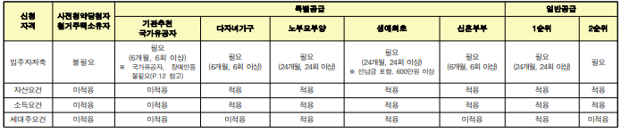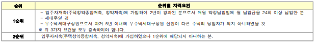 ① 입주자모집공고일 현재 입주자저축에 가입한 분으로서 아래 당첨자 선정방법의 순위별 자격요건을 구비한 무주택세대구성원