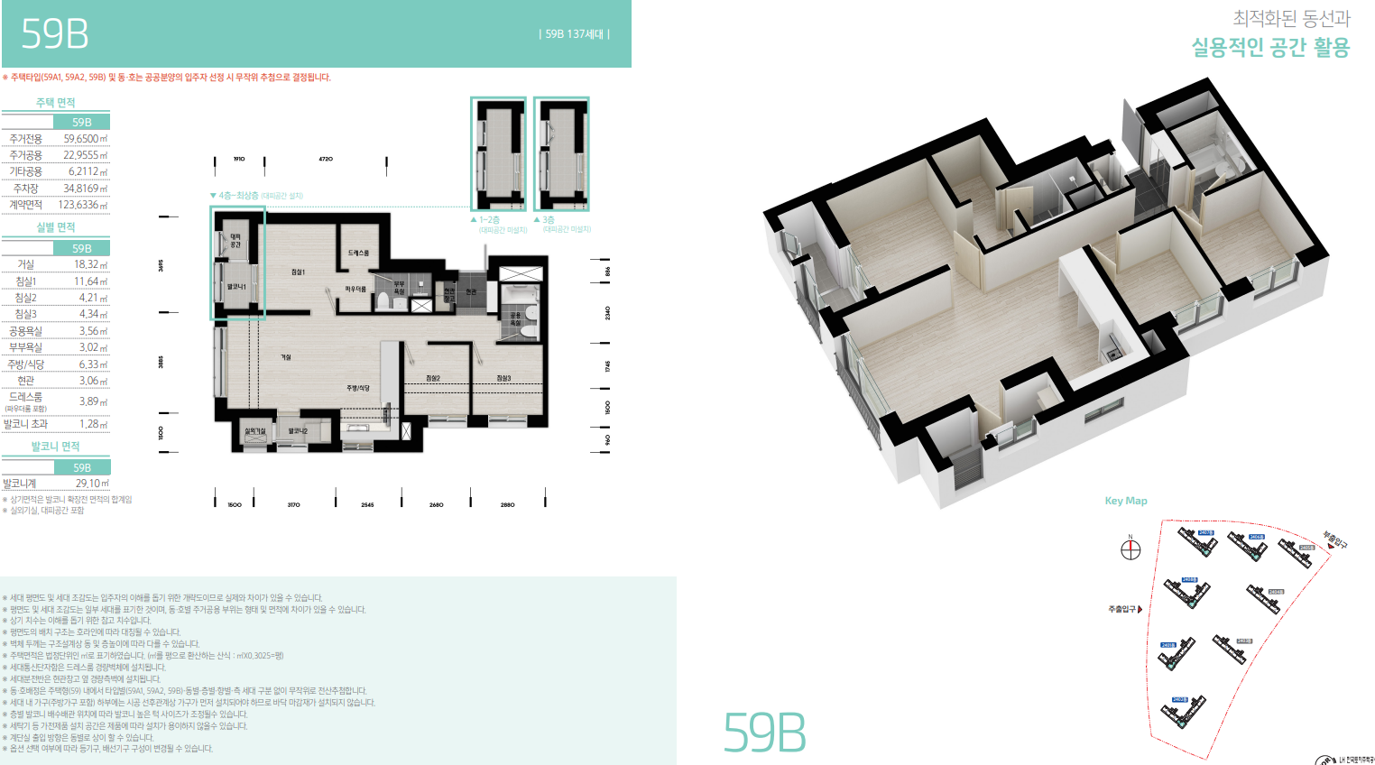 - 59㎡B : 거실1, 주방1, 욕실2, 침실3