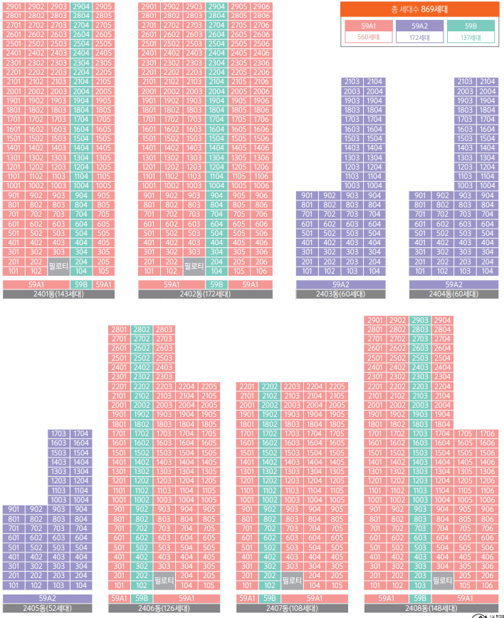- 세대수 : 869세대(59.65㎡ 137세대, 59.95㎡ 560세대, 59.97㎡ 172세대)